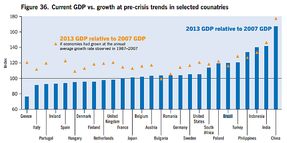 No gráfico acima, as setas indicam qual seria o crescimento do PIB mantidas as taxas anteriores a 2007. A barra azul o que de fato cresceu.